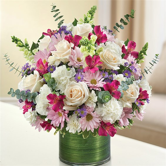 Sometimes all it takes is a simple gesture to bring back countless cherished memories. Our beautiful lavender and white sympathy arrangement filled with graceful lavender roses, alstroemeria and carnations, elegantly designed by hand in a graceful cylinder vase, is a touching tribute to a life well lived and the precious memories that will live on.