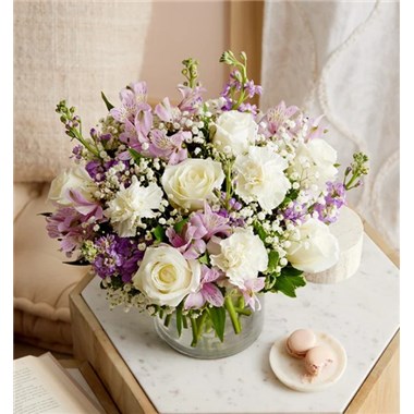 Lovely memories are made with thoughtful gifts for the ones we care about. Our charming lavender flower bouquet is loosely gathered with a medley of lavender & white blooms. Hand-designed inside a clear cylinder vase with cascading greenery all around, it’s a wonderful way to express the sentiments you have inside your heart.