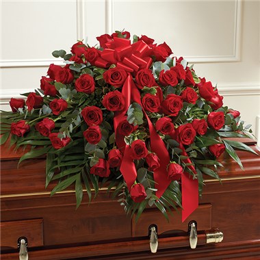 When someone near and dear to us passes, itās natural to want to express all the love and admiration we have in our hearts. Nothing conveys this better than a classic display of red roses. Our half casket cover, crafted with care and artistry by our expert florists with over 50 premium red roses, fresh greenery, and accented with a red satin ribbon, is an unforgettable way to commemorate a lifetime of esteem and adoration.